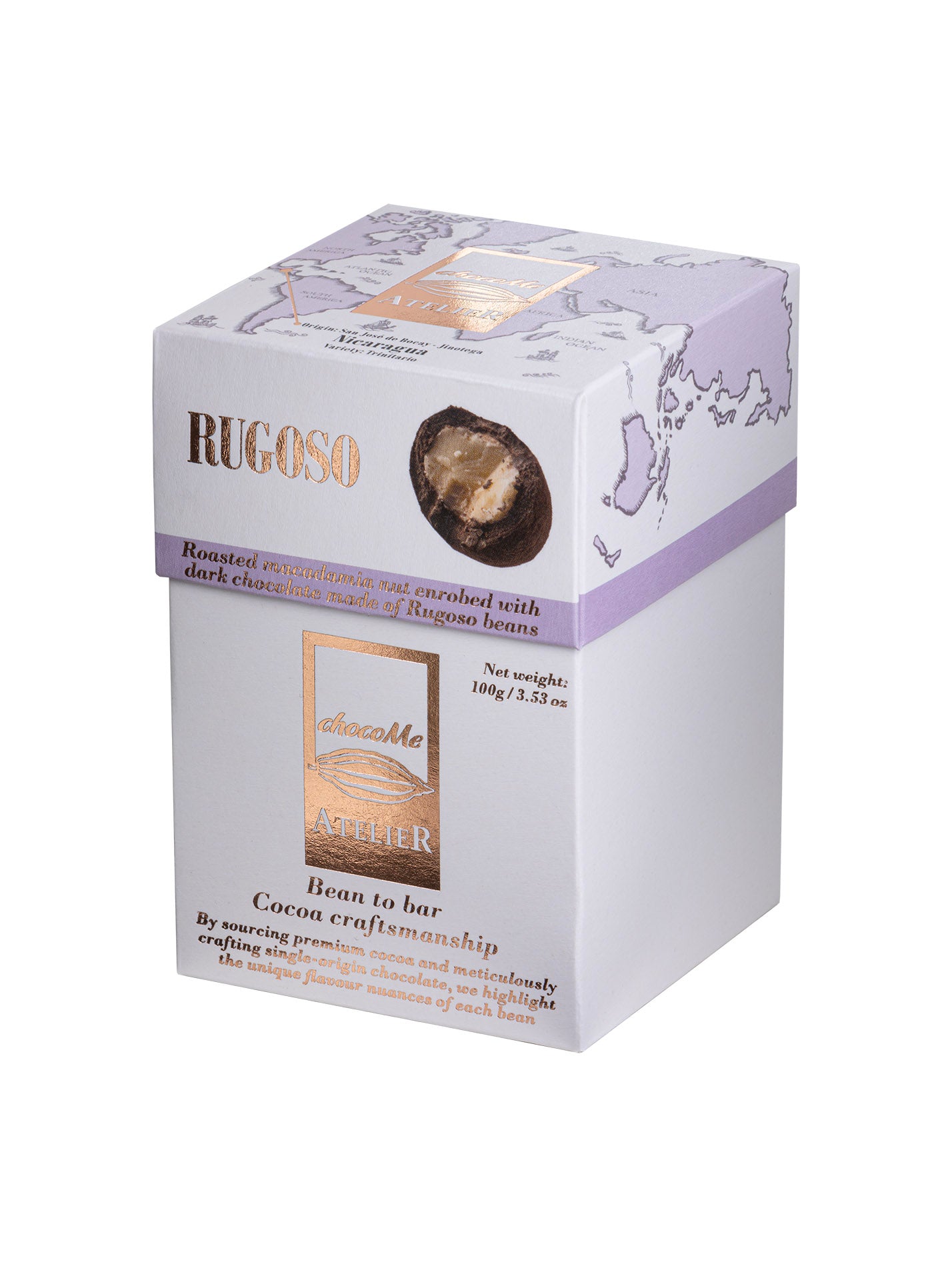 El chocolate Rugoso de Nicaragua tiene un sabor muy intenso que recuerda al pan de centeno. Este chocolate se combina con nueces de macadamia, que tienen el mayor contenido de grasa de todos los frutos secos. Las nueces de macadamia tienen un sabor cremoso y mantecoso que combina a al perfección con el chocolate Rugoso.